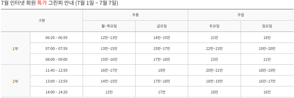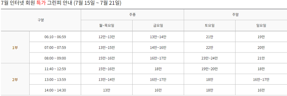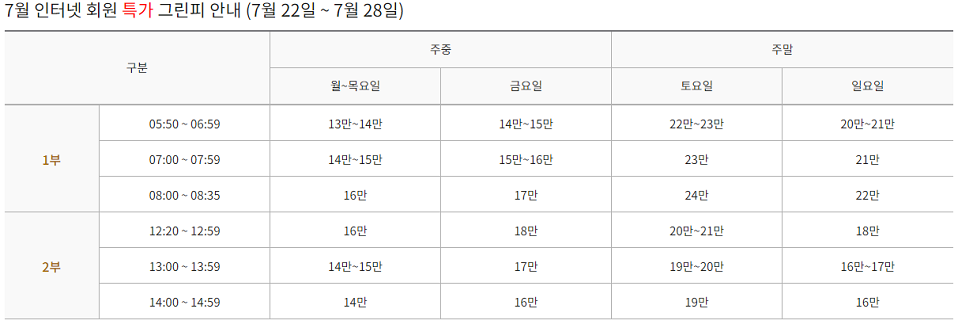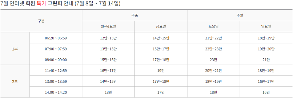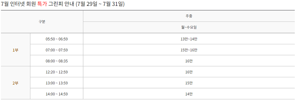 |공지사항 7월 인터넷 회원 특가 그린피 안내 등록일 : 2024-06-10 조회수 : 4589 첨부파일 : 자세한 날짜별 시간대 그린피는 실시간예약에서 확인가능합니다. 이전 6월 정상 그린피 안내 2024-06-07 다음 8월 인터넷 회원 특가 그린피 안내 2024-07-08 목록