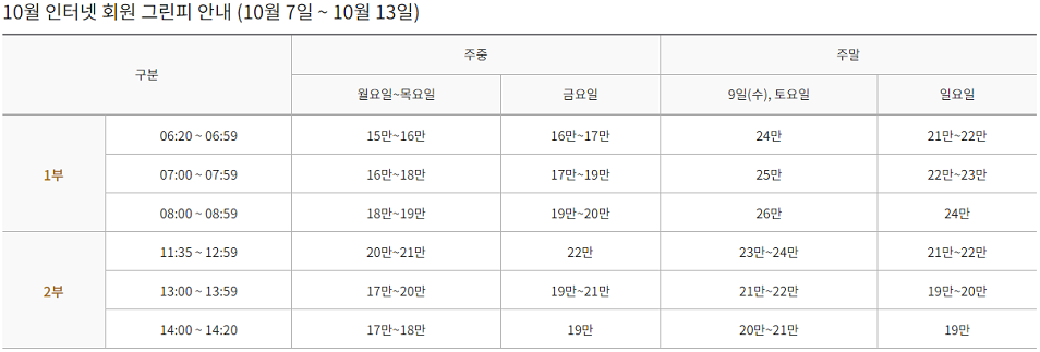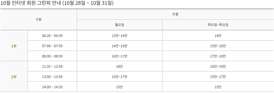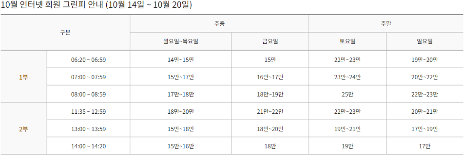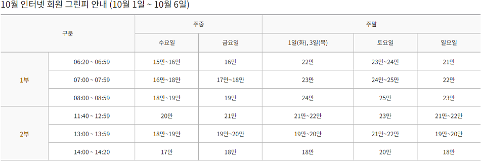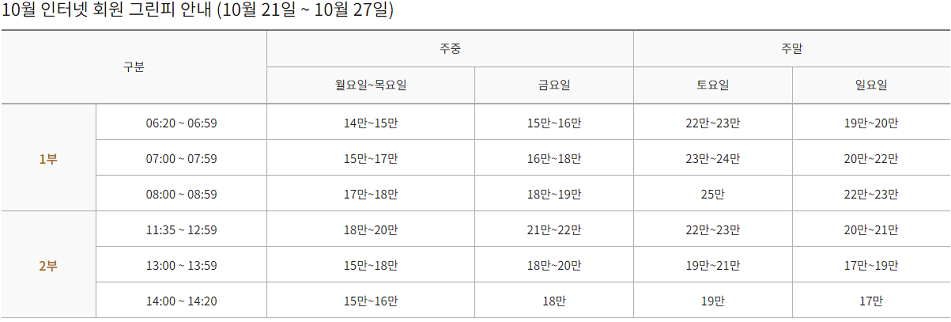 |공지사항 10월 인터넷 회원 그린피 안내 등록일 : 2024-09-11 조회수 : 6887 첨부파일 : 자세한 날짜별 시간대 그린피는 실시간예약에서 확인가능합니다. 이전 9월 인터넷 회원 그린피 안내 2024-08-06 다음 11월 인터넷 회원 그린피 안내 2024-10-09 목록