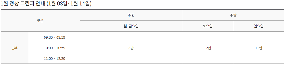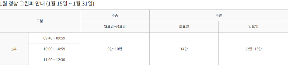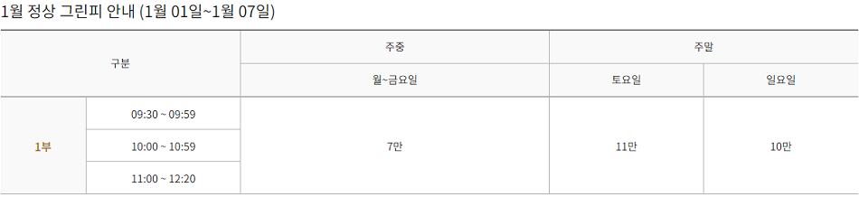 |공지사항 1월 정상 그린피 안내 등록일 : 2023-12-11 조회수 : 3222 첨부파일 : 자세한 날짜별 시간대 그린피는 실시간예약에서 확인가능합니다. 이전 12월 정상 그린피 안내 2023-11-06 다음 2월 정상 그린피 안내 2024-01-08 목록