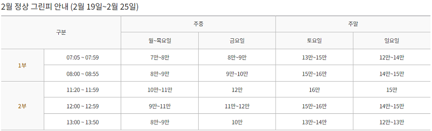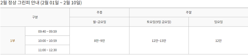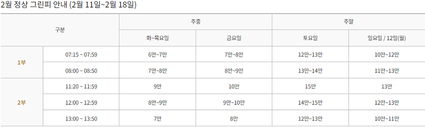 |공지사항 2월 정상 그린피 안내 등록일 : 2024-01-08 조회수 : 2710 첨부파일 : 자세한 날짜별 시간대 그린피는 실시간예약에서 확인가능합니다. 이전 1월 정상 그린피 안내 2023-12-11 다음 3월 정상 그린피 안내 2024-02-06 목록