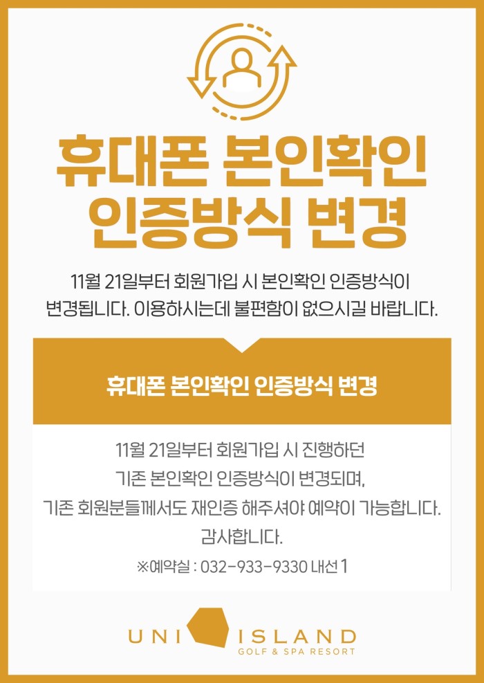 |공지사항 휴대폰 본인확인 인증방식 변경 안내 등록일 : 2022-11-18 조회수 : 2588 첨부파일 : 이전 캐디피 인상 안내 2022-08-15 다음 카트비 인상 안내 2022-11-30 목록