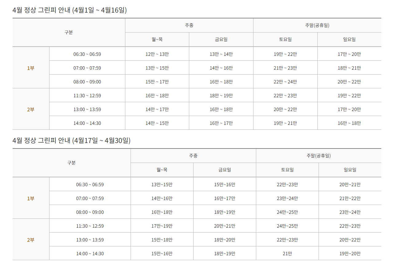 |공지사항 4월 정상 그린피 안내 등록일 : 2023-03-27 조회수 : 5200 첨부파일 : 자세한 날짜별 시간대 그린피는 실시간예약에서 확인가능합니다. 이전 김포 지역할인 종료 안내 2022-12-05 다음 5월 정상 그린피 안내 2023-04-11 목록