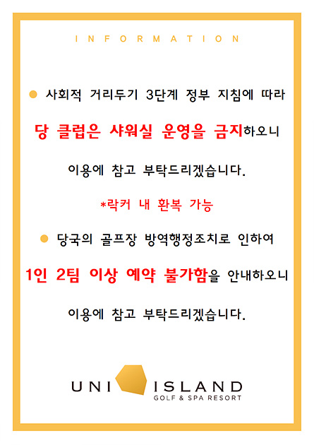 |공지사항 방역지침에 따른 골프장 조치사항 안내 등록일 : 2021-08-10 조회수 : 6960 첨부파일 : 이전 대행사 사칭 주의 안내 2020-10-06 다음 셀프라운딩(노캐디) 카트 세팅비 안내 2021-08-20 목록