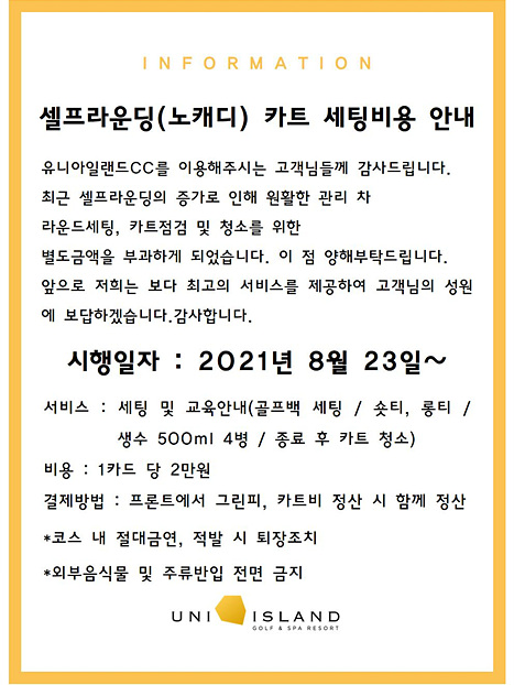 |공지사항 셀프라운딩(노캐디) 카트 세팅비 안내 등록일 : 2021-08-20 조회수 : 9394 첨부파일 : 이전 방역지침에 따른 골프장 조치사항 안내 2021-08-10 다음 예약권 불법 판매 금지 안내 2021-11-05 목록