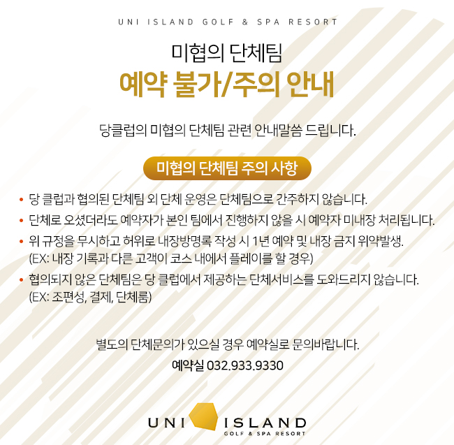 |공지사항 미협의 단체팀 예약 불가/주의 안내 등록일 : 2022-04-14 조회수 : 4446 첨부파일 : 이전 예약 실명제 실시안내 2021-11-29 다음 캐디피 인상 안내 2022-08-15 목록